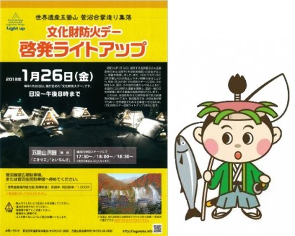 今月26日に世界遺産菅沼合掌集落では、『文化財防火デー啓発ライトアップ』が開催されるよ。